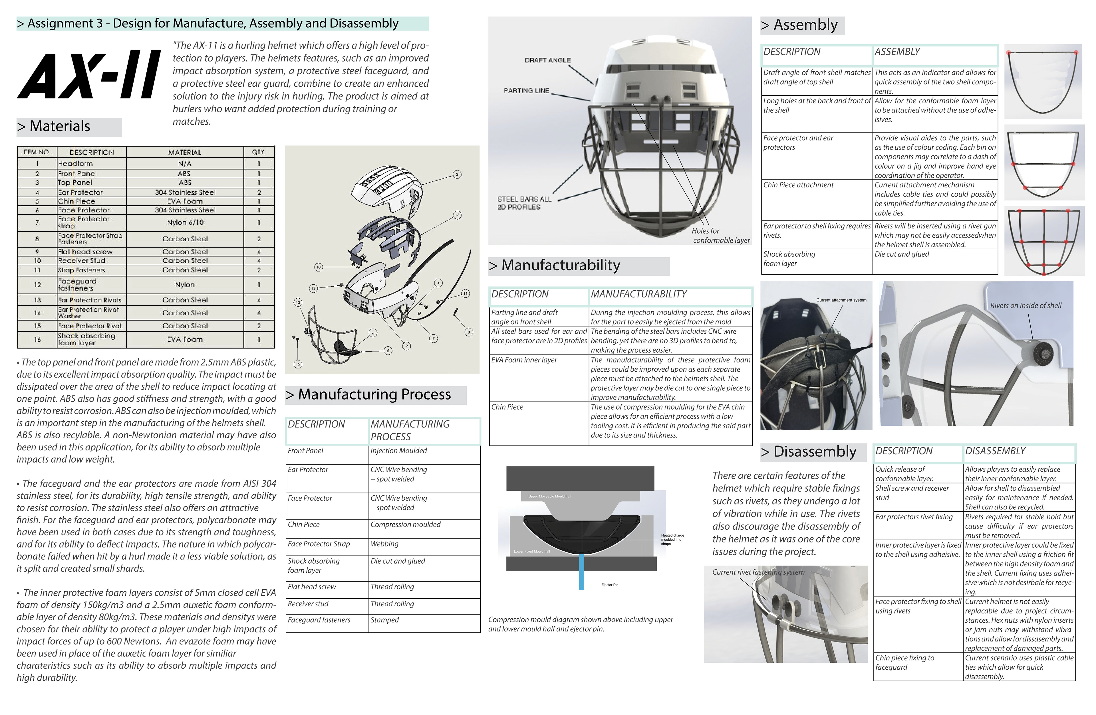 The following two research posters examine the manufacturability of products and the optimization of the manufacturing process. The second poster focuses specifically on the manufacturing processes invloved in a previous project, the AX-11 hurling helmet. These posters are designed to be printed in A1 format, hence the amount of information included and the text size.
